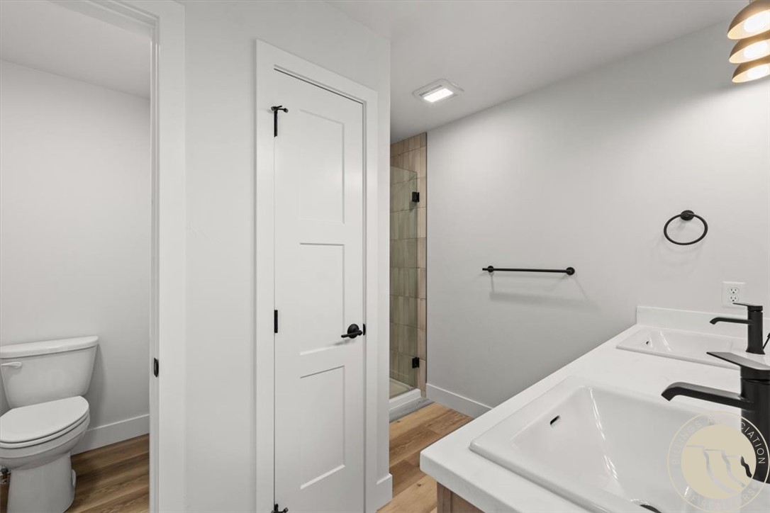 primary suite includes a walk-in tile shower, double vanity, and large walk-in closet. Two more bedrooms, a full